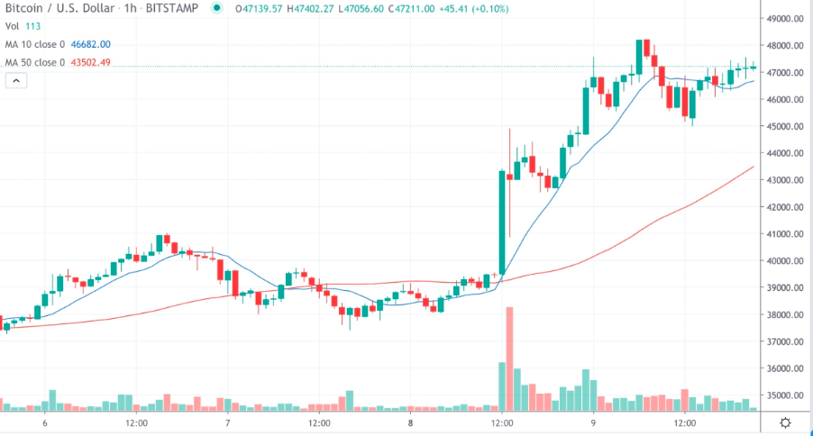 美國電動車大廠特斯拉(Tesla)於週一(2/8)宣布購入 15 億鎂比特幣的重大利多消息,為近期價格疲弱的比特幣重燃牛市熱火,讓比特幣價格在 24 小時內瘋狂飆升 23%,從 39,155 美元一路攀升至 48,192 美元,強勢寫下歷史新高。本文截稿前,比特幣小幅回落,報 46,568 美元。