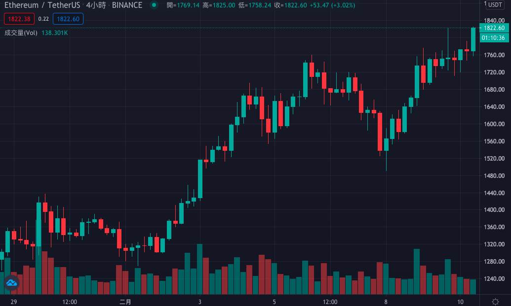 觀察以太幣(ETH)走勢,受到比特幣大漲影響,以太幣從上週的重跌強勢回復,價格從 1,490 美元大漲再突破 2 月 6 日新高,至本文截稿前以太幣仍在續寫新高,報 1,822 美元,24 小時漲幅 5.3%。
