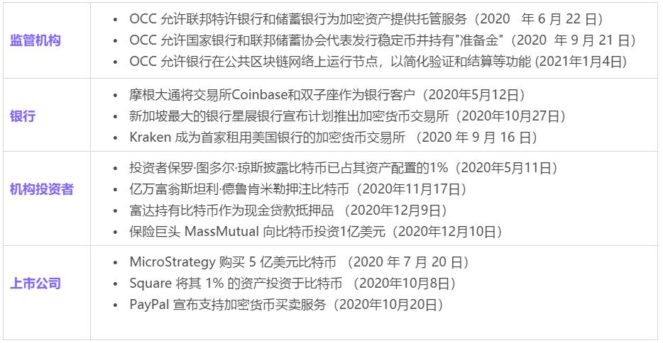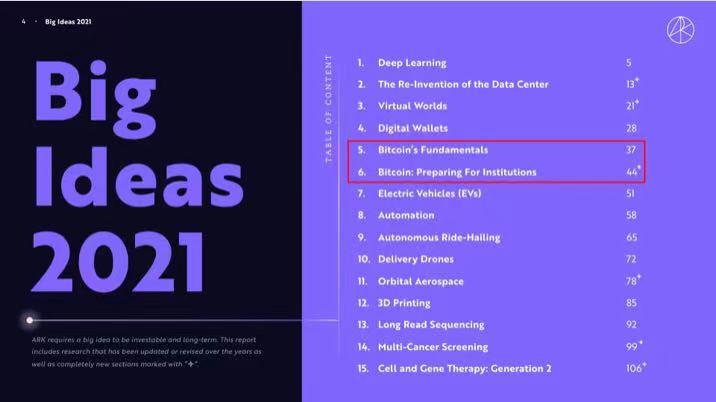 而今年 1 月 27 日發佈的 ARK 2021 Big Ideas 中,伍德在總計 15 個章節中,專門用 2 個章節闡述了比特幣的基本面以及機構配置比特幣的深入分析,ARK 預期未來比特幣將成爲衆多機構和上市公司資產負債表的一部分,迎接比特幣的將會是星辰大海。