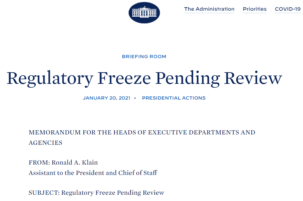 統整該備忘錄內容,為了確保拜登政府能掌控所有新釋出、待決的規則,於 1 月 20 日中午之後由總統任命的官員不得發布任何新規,也不能向聯邦公報局(the Office of the Federal Register,OFR)發送新法。已經發送至 OFR、但尚未刊載於《聯邦公報》的法規則須立即撤回。