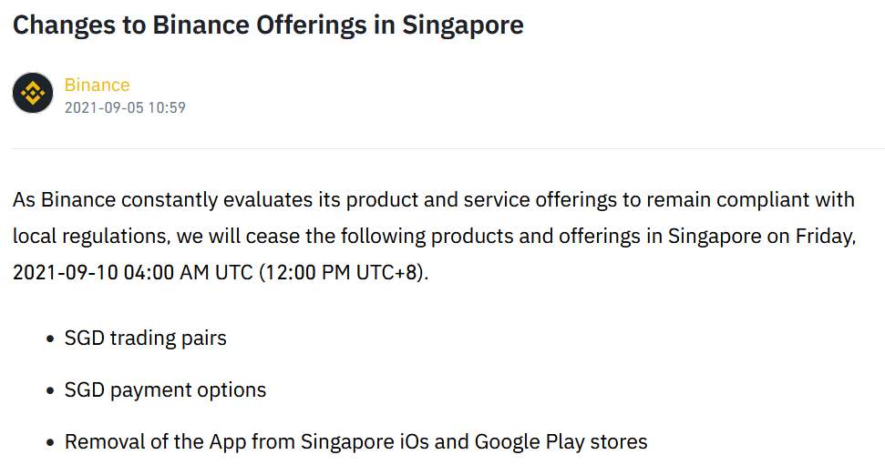 加密交易所幣安(Binance)6 日晚間 11:00 點發布公告,自台灣時間 9 月 10 日中午 12:00 起移除新加坡幣交易對和星幣支付,也將把幣安應用程式從星國的 iOS、Google Play 中下架。幣安建議使用者於前一天中午就將手頭的交易完成,並撤除相關的廣告避免潛的糾紛。