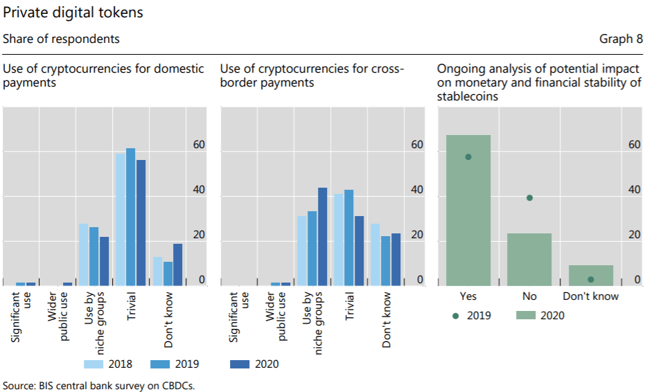 報告特別指出 CBDC 和一般加密貨幣(如比特幣)、私營數位貨幣(如美元穩定幣 USDT 發行商 Tether)不同,研究的動機、重點也各異。對於加密貨幣,大部分央行仍視其為小眾產品(niche products),未有廣泛應用;而穩定幣研究則側重其快速被消費者採用的能力。