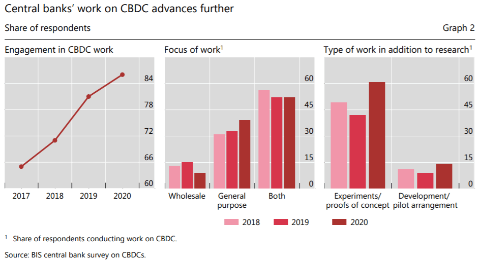 BIS 研究人員總結道,儘管大部分中央銀行都正在探索 CBDC 的用例,整體而言,從純概念研究到實驗、試點的項目也越來越多,但距離 CBDC 的廣泛應用似乎還有一段距離。
