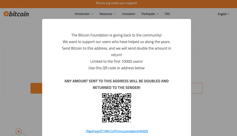 非營利組織 bitcoin.org 今日疑遭到駭客入侵,主網頁上顯示一個詐騙資訊:要求用戶將比特幣發送到一個特定地址,並承諾他們將獲得雙倍的回報。該網域截稿前仍暫時沒辦法瀏覽,經營團隊表示仍在調查中。