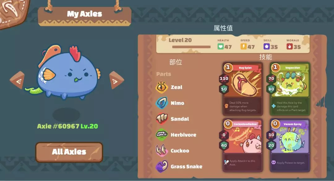 CryptoKitties 問世之時,靠著其可愛的外表俘獲了無數圈內圈外用戶的心。Axie 在可愛這方面絕對不輸 CryptoKitties,各種可愛搞笑的部位聚在一起,而且完全沒有違和感。Axie 有著嚴格的「計劃生育」,每個 Axie 最多能繁殖 7 次後代,而且不會出現像 CryptoKitties 一樣大量的純色貓或者斑點貓,每隻 Axie 都有獨特的萌點。在此之上,Axie 還增加了獨有的戰鬥屬性,成為了最早能戰鬥的 NFT 寵物之一。