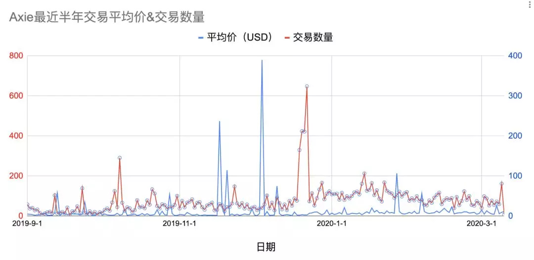 我們還計算了 Axie 近半年的交易量與平均交易額,可以看到在 12 月 19 號發布 Axie Alpha 版本之後 Axie 的交易量和交易額都有了不少提升,目前一個 Axie 至少價值 0.01 ETH,玩家不用擔心自己的 Axie 會大幅貶值。