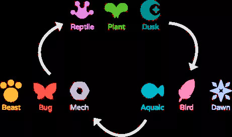 Axie 一共有 9 個種類,包括:【爬行類、植物類、黃昏類】【水生類、鳥類、黎明類】【野獸類、昆蟲類、機械類】。他們之間存在著如下的克制關係,處於克制關係中的 Axie 會造成 20% 的額外傷害。