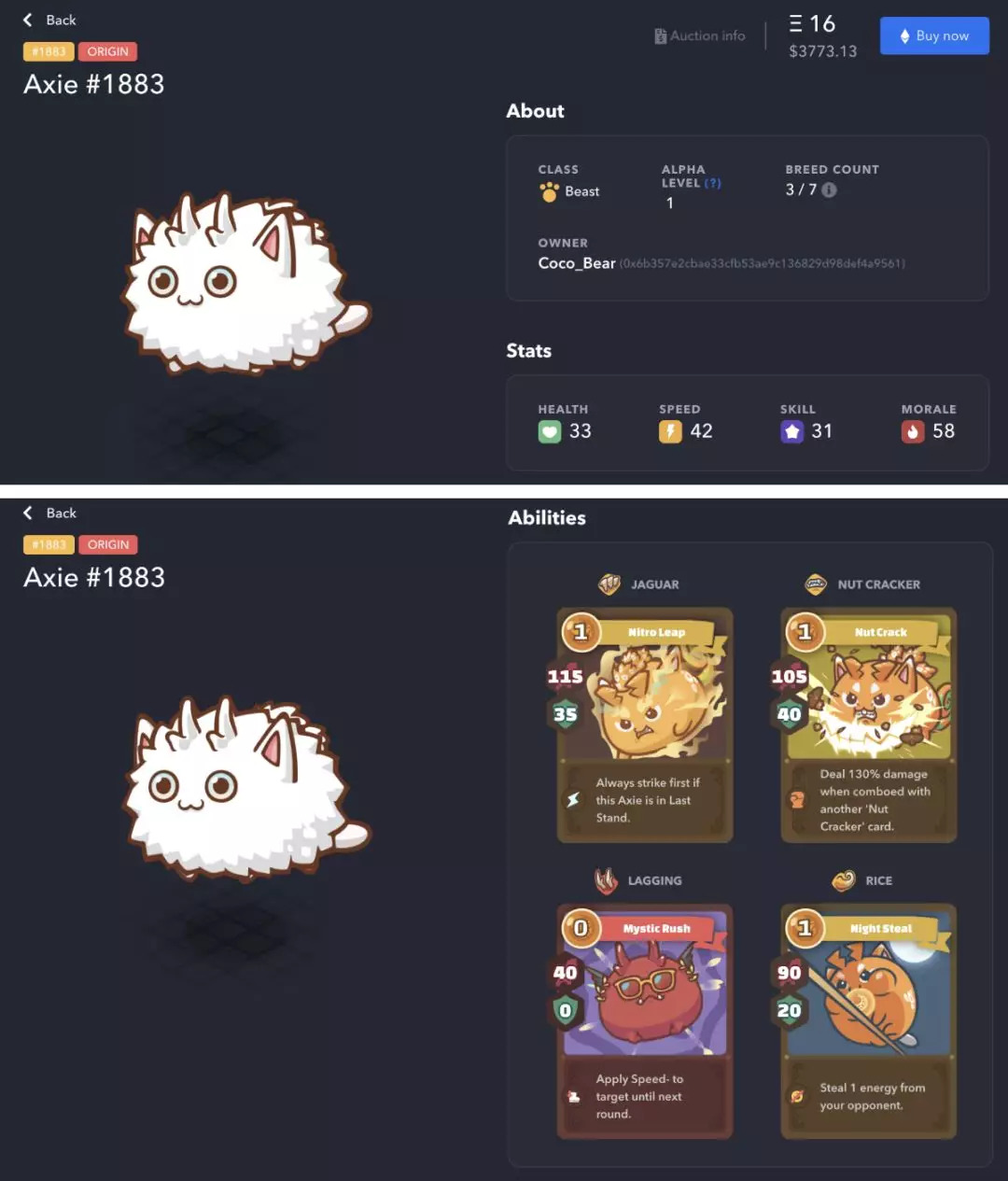 1. 屬性分佈:Axie 的屬性總值都是 164,那麼屬性點的分佈就決定了 Axie 是 DPS 還是坦克。技能值和士氣值是 DPS 最需要的,1883Axie 的技能值 31,士氣值 58,總和 89,是相當出色的 DPS 屬性。