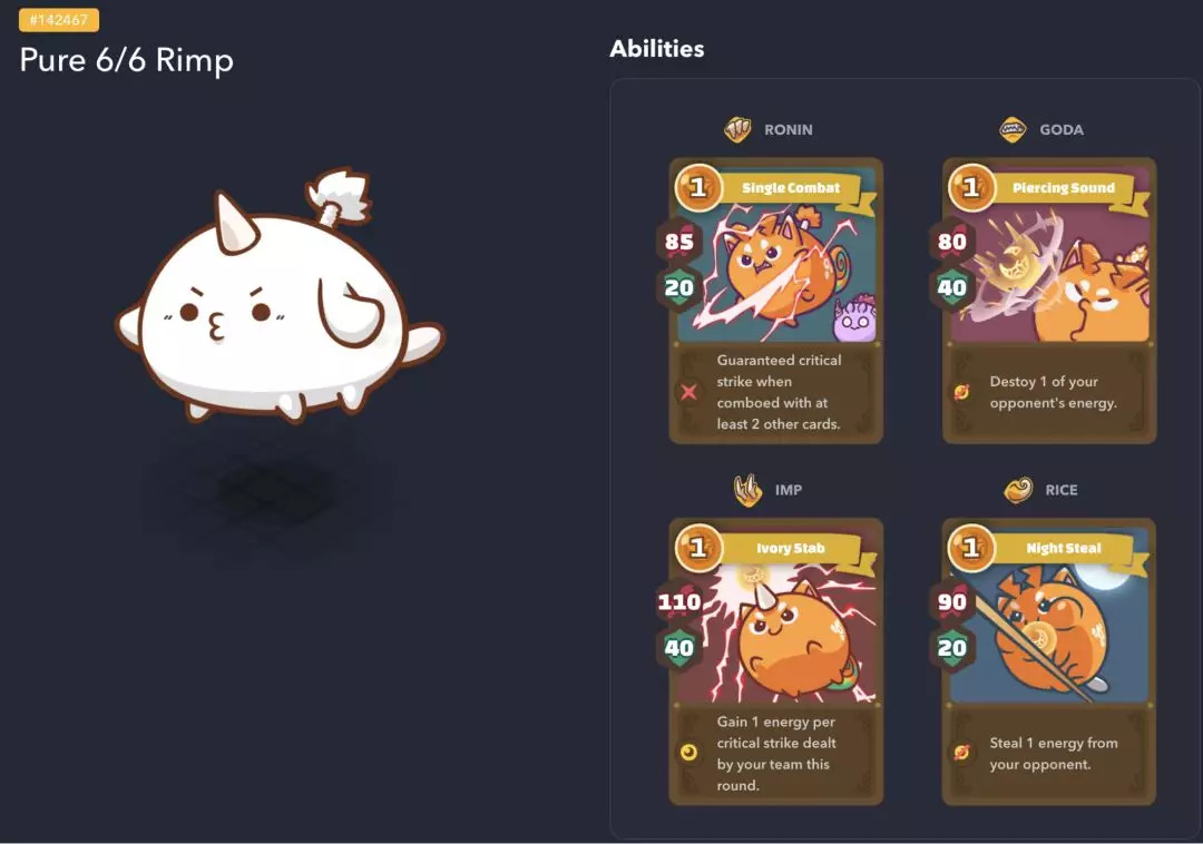 各種牌之間有著相當豐富的技能組合和 Axie 配合,熟練運用它們就是取勝的關鍵。舉個例子,下圖是一個我十分看好的 Axie,三個技能都能壓制敵方的能量資源,實戰中一定能讓對手相當噁心。
