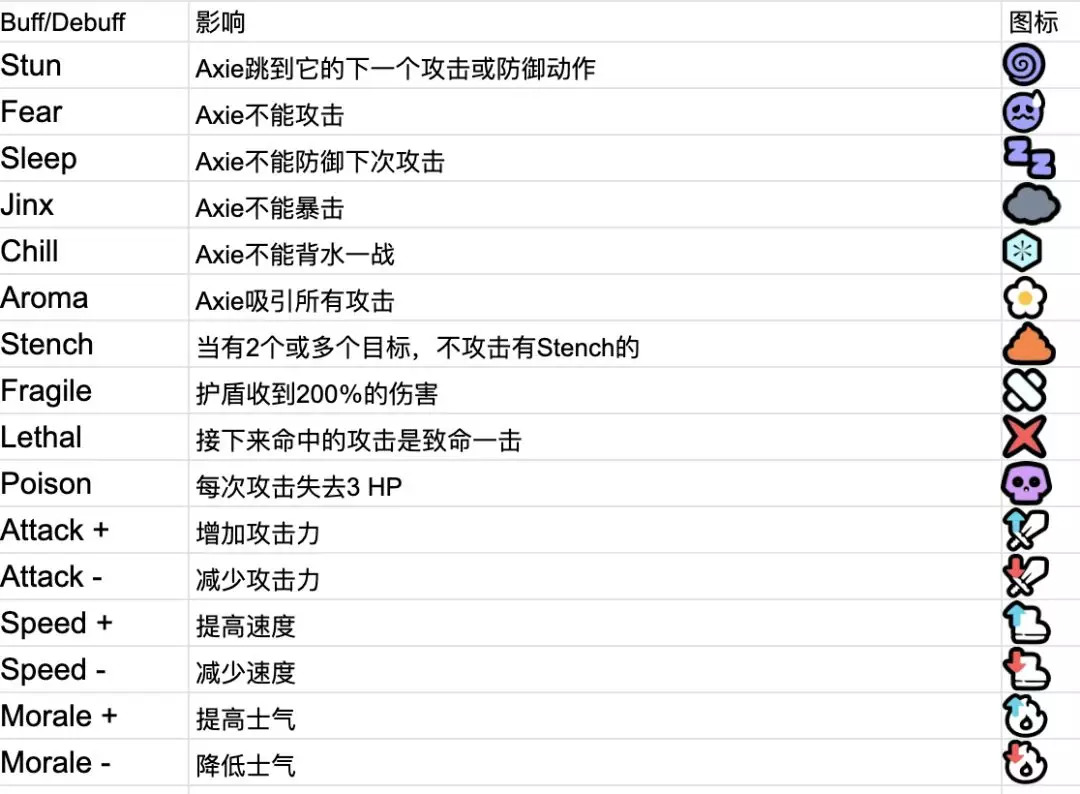 本文還總結了遊戲中的各種 Buff/Debuff,它們也是 Axie 戰鬥中的關鍵點。