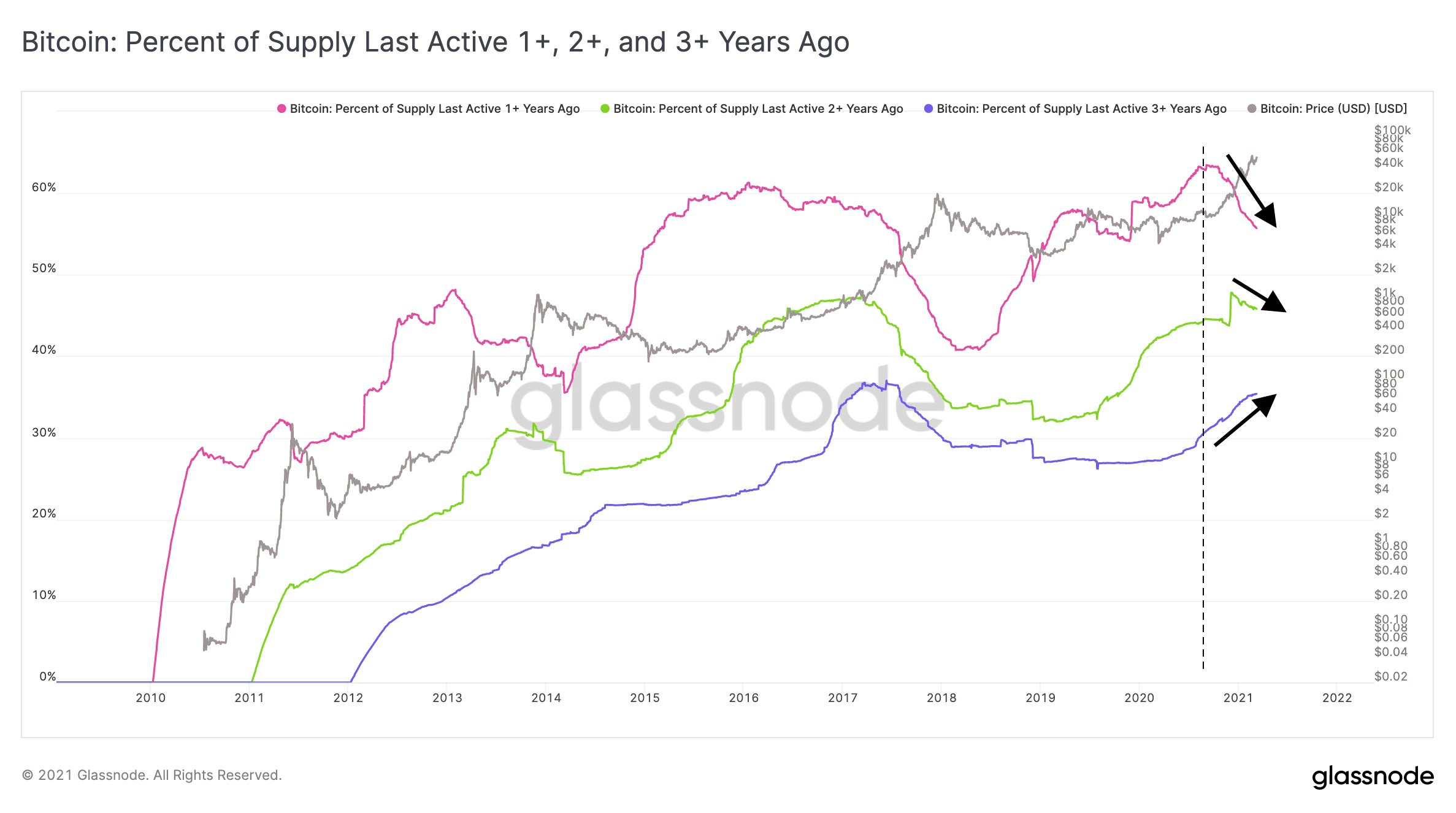 -一年、兩年、三年以上未活動比特幣占總供給量比例|來源:Glassnode-