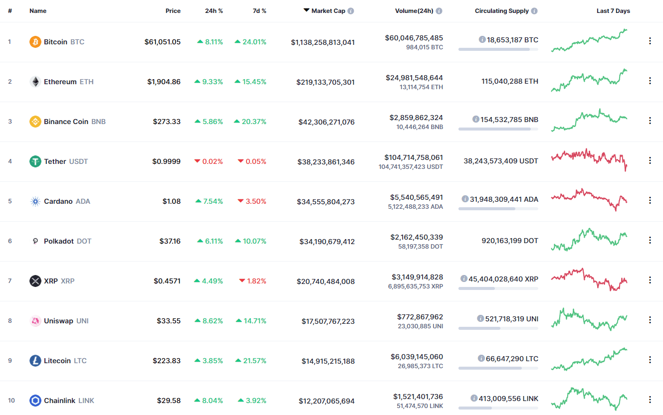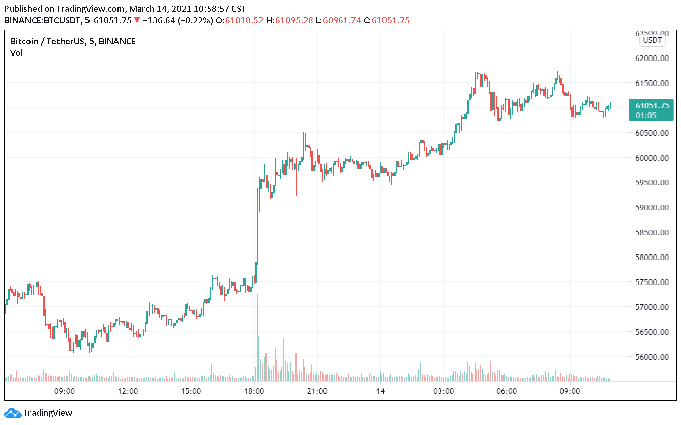 基於美元印鈔、機構資金進場的環境,加上近來 NFT 爆紅,為加密市場帶來更多關注,屢次挑戰 5.8 萬前高的比特幣終於突破阻力位。昨(13)日傍晚首次站上 6 萬美元大關後,持續上探,本日清晨以 61,844 美元寫下新高,七日漲幅 28%。