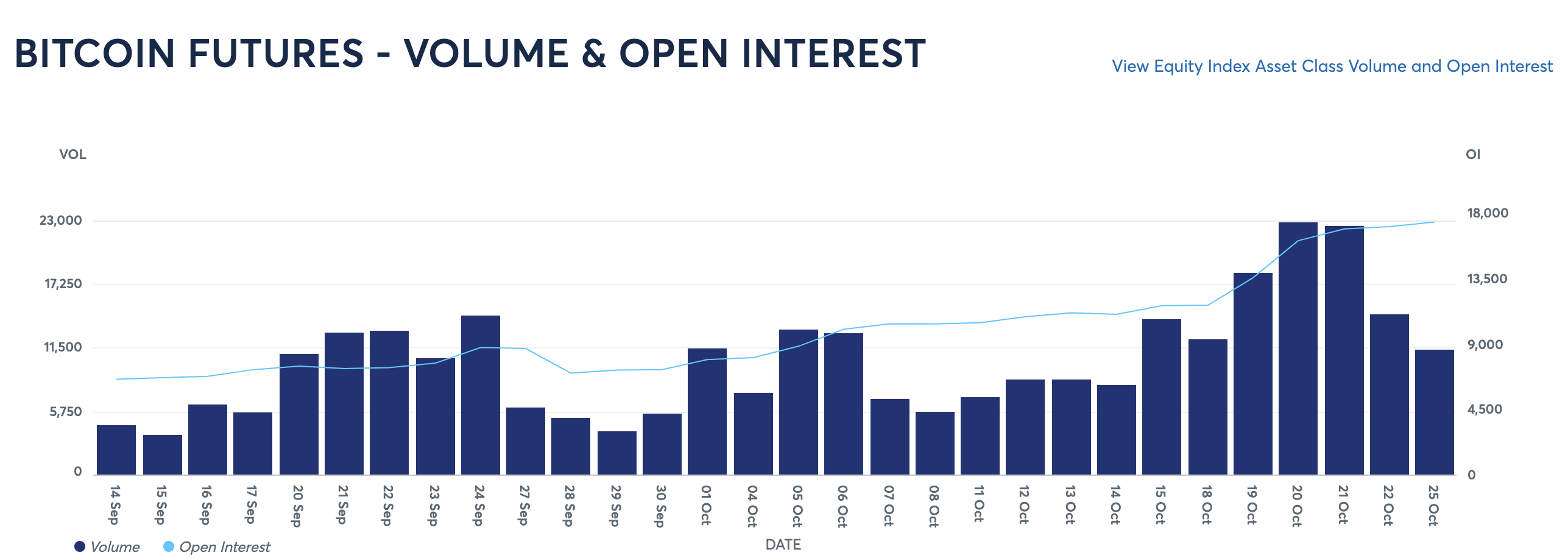 由於近期首支上市的比特幣期貨 ETF 引起投資者投資與濃厚興趣下,僅僅前三十分鐘就累積超過 3.2 億美元交易量、首日更突破 10 億美元帶動了期貨市場整體買氣。