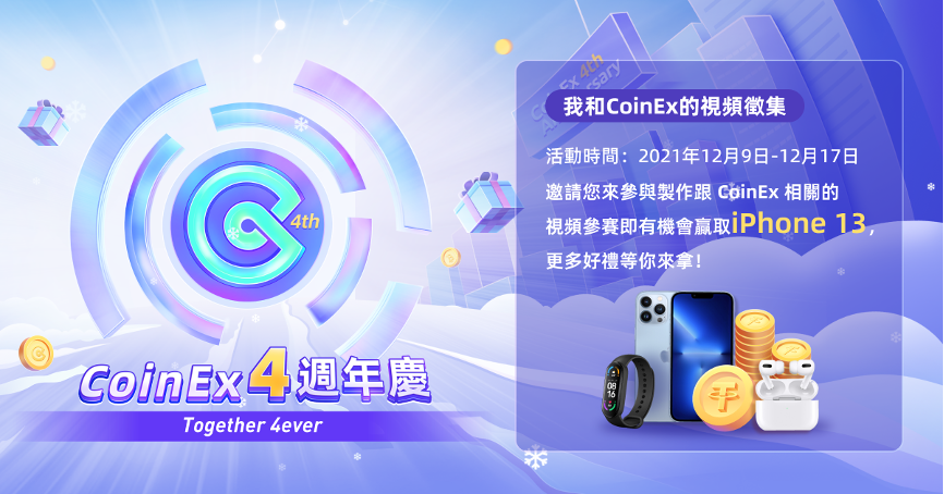 CoinEx 交易平台迎來四週年,為回饋用戶, 12 月即將開啟第一輪全球歡慶月活動 「我和 CoinEx 的故事」,徵集與 CoinEx 相關文字、圖片與影片,不限時長,不拘創意,參與活動有望獲得 iPhone、USDT 和 CoinEx Token (CET) 等多重福利獎品。