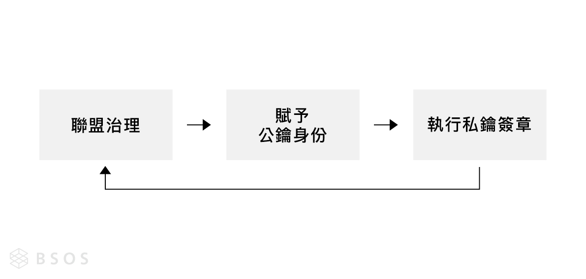 聯盟鏈的准入制與實名制能夠讓各企業透過聯盟治理的程序知道並認同:哪個「公鑰」代表哪間公司,以認定該私鑰簽章的企業身份。