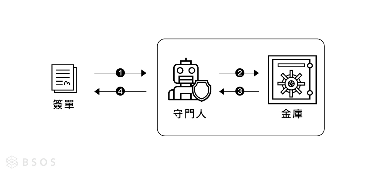 - 守門人會判斷調用者及簽單是否滿足調用權限,若滿足則把「簽單」投入金庫;