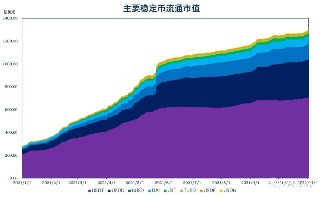 根據 CoinMarketCap 數據,截至 10 月 31 日,主要穩定幣流通市值總計 1,250 億美元,比上月增長 41.1 億美元。它們分別為 USDT 703 億美元、USDC 332 億美元、BUSD 136 億美元、DAI 64.7 億美元、UST 27.9 億美元、TUSD 11.9 億美元、USDP 9.45 億美元、USDN 6.05 億美元,USDT、USDC、BUSD、UST、USDN 流通量小幅上升,DAI、TUSD、USDP 流通量下降。