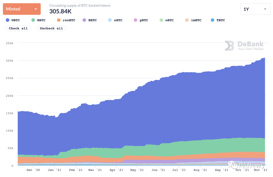 以太坊上的比特幣錨定幣發行量由 283,960 枚增至 303,933 枚,上升 7.03%。WBTC 的占比從 72.46% 進一步升高至 74.82%,而 HBTC 的占比從 14.05% 降至 13.08%,後者的發行量也有所下降。