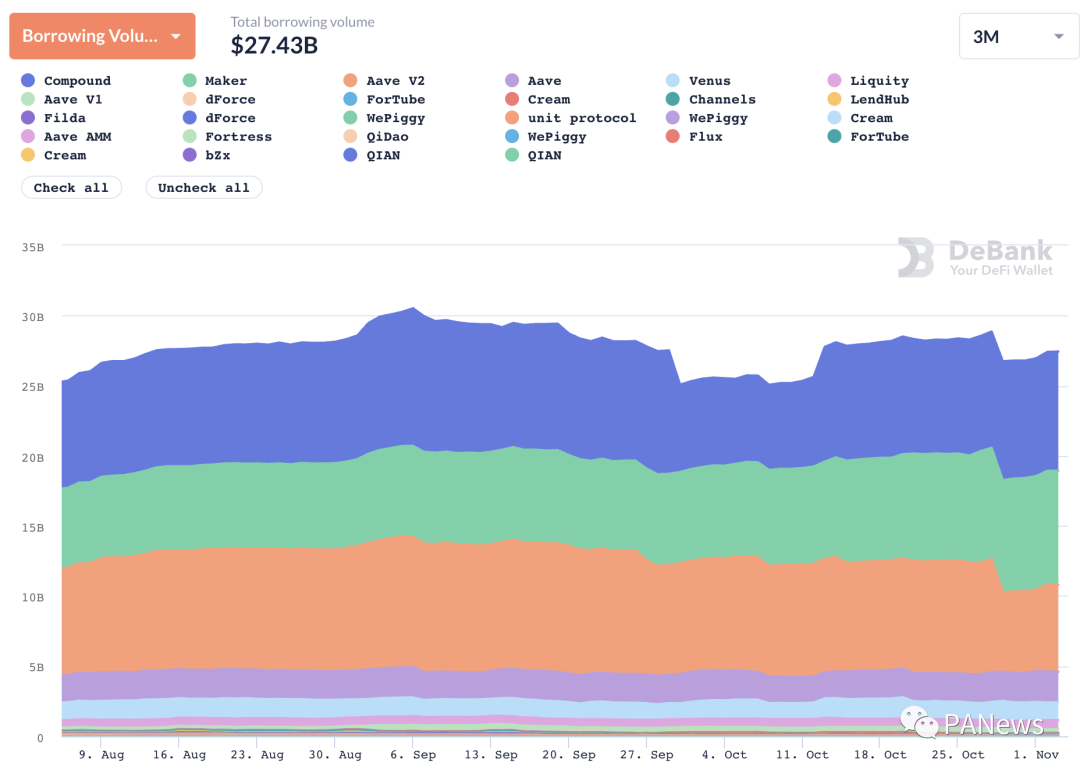 截至 10 月 31 日,DeFi 協議中的總借款量為 268 億美元,在過去一個月上升 6.8%。Compound 超過 Aave V2,重新成為總借款量最高的借貸協議,MakerDAO 位居第二。