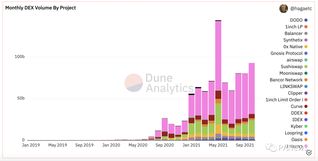 在其它鏈上,PancakeSwap 近期每天超過 10 億美元的交易量遠超 BSC 生態中的其它交易所,整體僅次於 Uniswap;Solana 上 Raydium、Serum、Saber、Orca 的 TVL 均超過 10 億美元,其中 Raydium 的 TVL 剛好超過 20 億美元;Avalanche、Fantom、Polygon 則分別以 Trader Joe、SpookySwap、Quickswap 為主。
