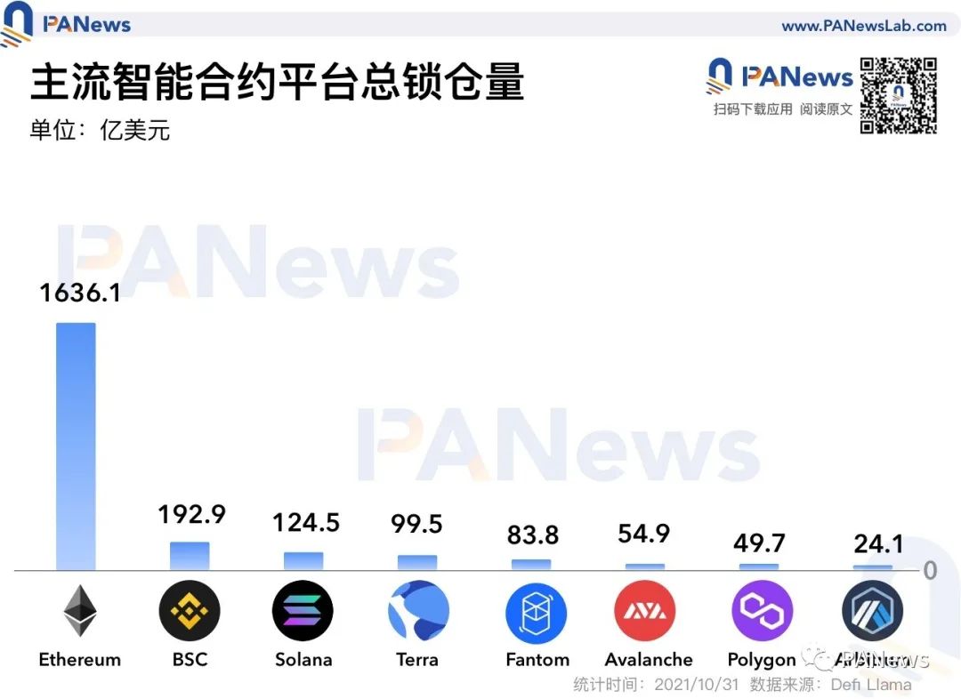 Defi Llama 數據顯示,截至 10 月 31 日,所有智能合約平台上 DeFi 項目中的總鎖倉量(TVL)為 2,426.1 億美元,其中 Ethereum 1,636 億美元、BSC 193 億美元、Solana 125 億美元、Terra 99.5 億美元、Avalanche 83.8 億美元、Fantom 54.9 億美元、Polygon 49.7 億美元、Arbitrum 24.1 億美元。
