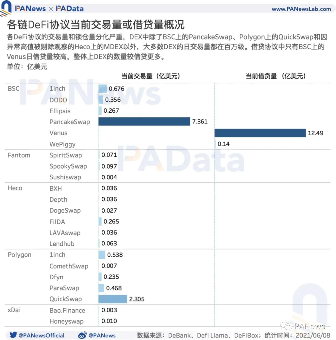 交易量或借貸協議的靜態借貸量來看,6 月 8 日,受到流動性挖礦的影響,Heco 上的 MDEX 靜態交易量達到了約 22 億美元,遠遠高於其他協議,為了更準確的反映全貌,在此不納入分析。