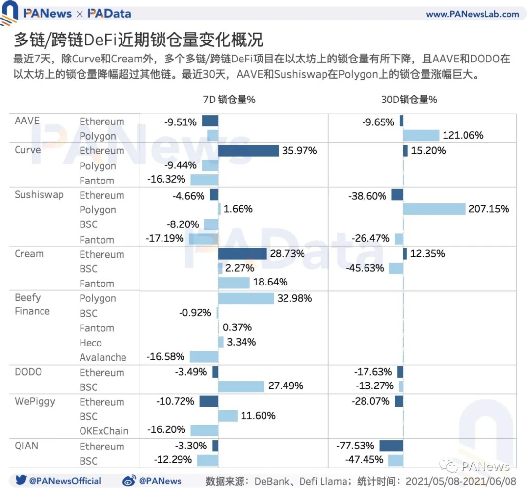 可以發現,最近 7 天,除 Curve 和 Cream 外,其他觀察範圍內的多鏈 DeFi 項目在以太坊上的鎖倉量均有所下降,且 AAVE 和 DODO 在以太坊上的鎖倉量降幅超過了其他鏈,前者以太坊鎖倉量降幅較其他鏈鎖倉量降幅高了 3.2 個百分點,後者則相差近 30 個百分點。