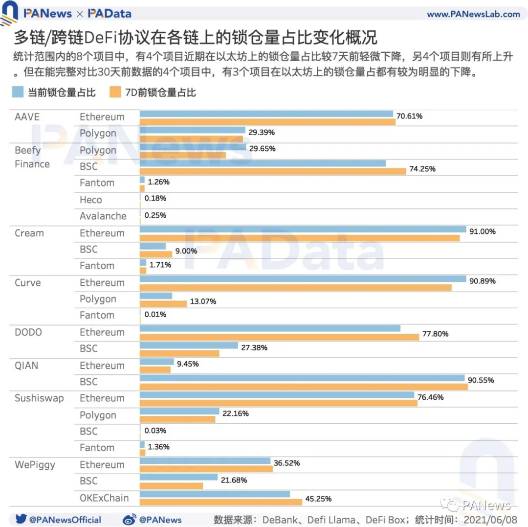 各鏈鎖倉量佔比的相對變化也許比絕對鎖倉量變化更能回應這個問題。在統計範圍內的 8 個項目中,AAVE、DODO、Sushiswap 和 WePiggy 這 4 個項目近期在以太坊上的鎖倉量佔比較 7 天前輕微下降,降幅分別為 0.72 個百分點、5.18 個百分點、0.91 個百分點和 0.60 個百分點。