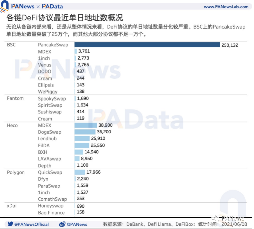 從靜態地址數來看,Heco 上 DeFi 的平均地址數達到了 2.56 萬個,而其他鏈的平均地址數大多為 1,000-2,000 個左右,最少的 xDai 的平均地址數只有 424 個。就單個協議而言,地址數最高的是 PancakeSwap,約為 25.01 萬個,另外還有多個協議的地址也超過了 1 萬個,而地址數較少的協議,其地址數則大多低於 500 個。