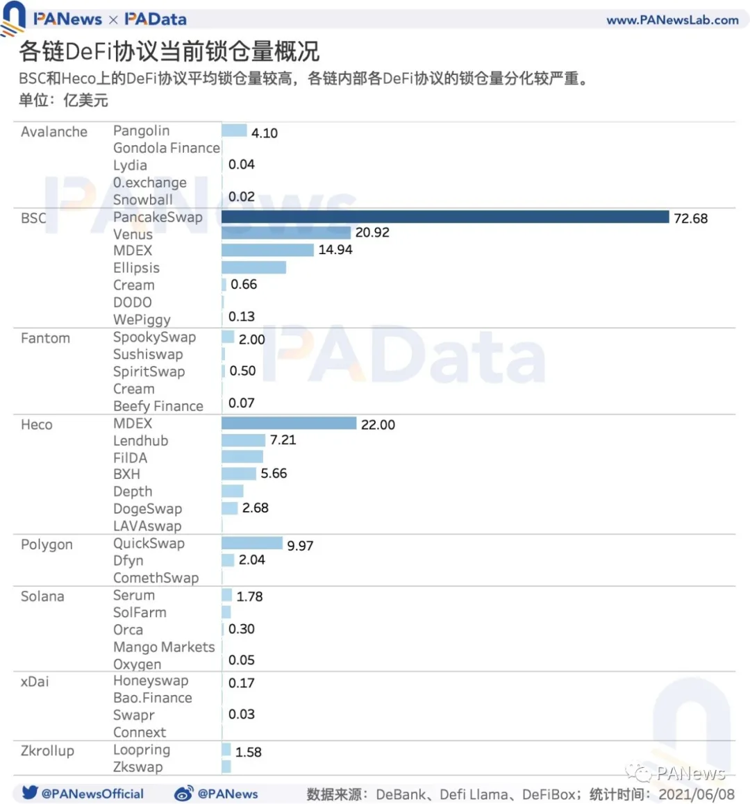 值得關注的是,BSC 上的 PancakeSwap、Venus、MDEX、Ellipsis,Heco 上的 MDEX,Polygon 上的 QuickSwap 的靜態鎖倉量都顯著高於同鏈上其他協議,最高的 PancakeSwap 達到了 72.68 億美元。但除此之外,這些鏈上的大多數 DeFi 協議的鎖倉量都在 6,000 萬美元以下。