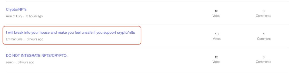 但沒想到,該則貼文一發佈,引起了部分用戶強烈反對,紛紛留言:「不要導入 NFTs 和區塊鏈到Discord」、「NFT是垃圾並且破壞環境,不要提供支援」並揚言要離開 Discord,全力阻止官方導入這項新功能。