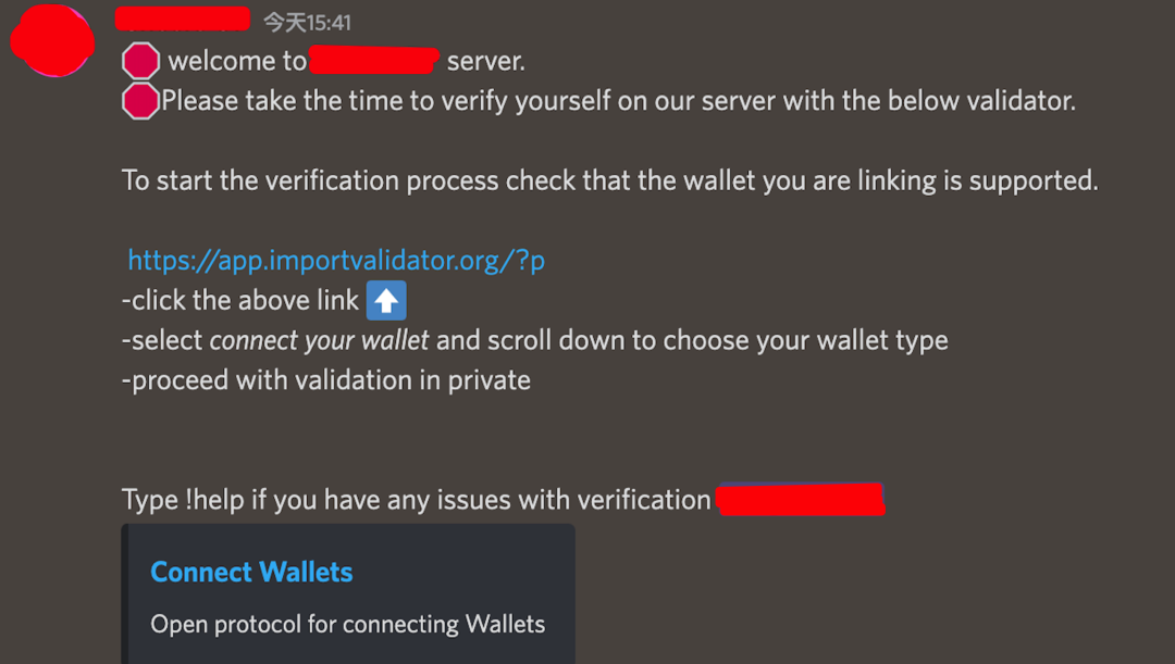 經過分析,這個帳號是一個偽裝成 Captcha.bot 機器人的普通帳號,當我加入到官方伺服器後,這個假 Captcha.bot 機器人立刻從官方伺服器私訊我假的驗證連結(看著像是自動化識別新加入的用戶,自動構造連結並私發釣魚連結),從而引導我輸入錢包密碼和助記詞。
