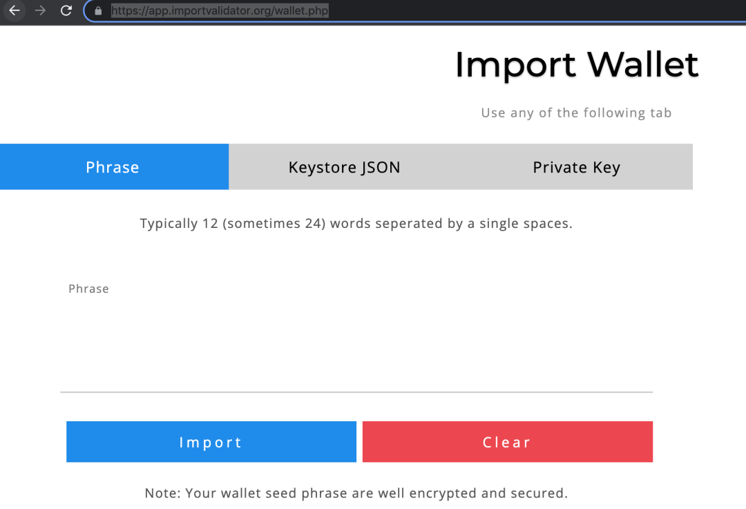 這次釣魚者講的故事是在連結中導入助記詞進行身份驗證,然而不是採用假小狐狸(MetaMask)的介面來欺騙用戶,而是直接在頁面上引導用戶輸入助記詞了,這個釣魚手法就沒這麼真(釣魚手法太粗糙)。