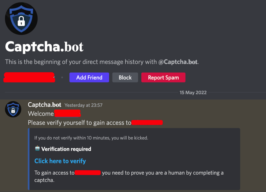 在我加入伺服器後立刻就有一個「機器人」(Captcha.bot)私訊要我進行驗證。這一切看起來相當的合理。我也點擊了這個驗證連結進行查看。