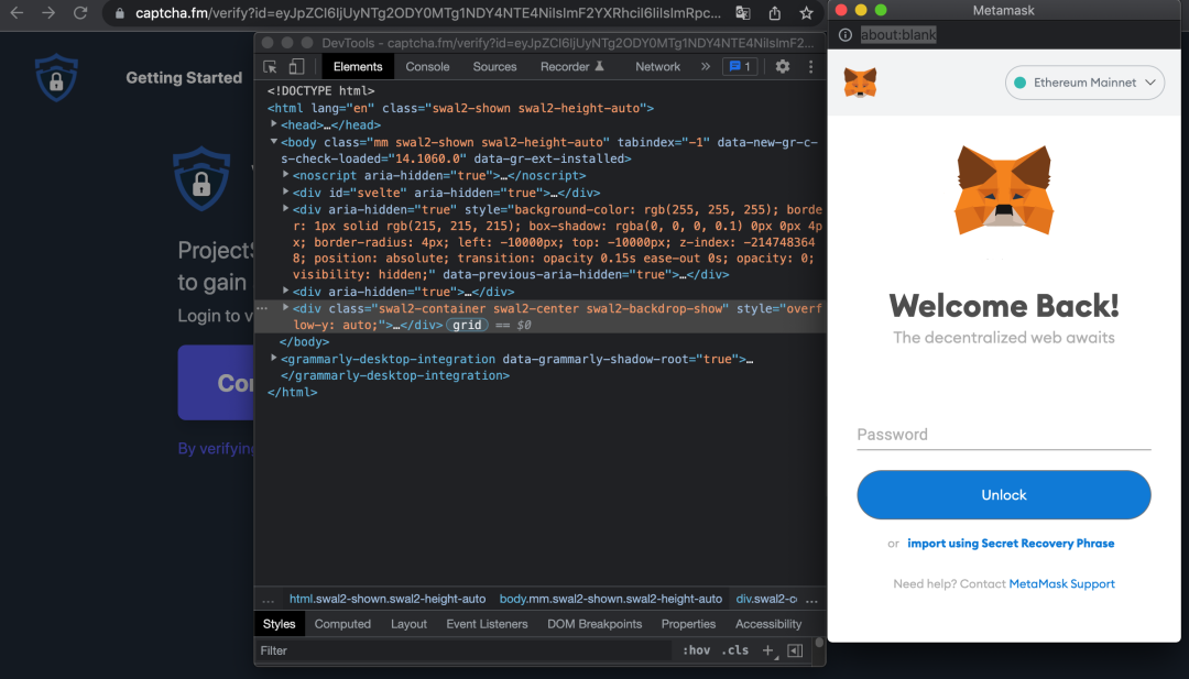 我訪問「機器人」(Captcha .bot)發來的連結後,是有讓我進行驗證的,但是當我驗證通過後,發現它要求喚起我的小狐狸(MetaMask)錢包,喚起的錢包介面挺真實的。