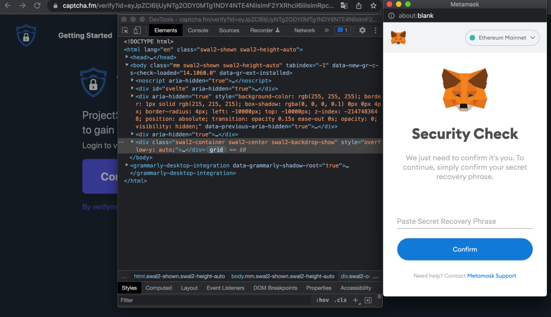 在隨意輸入密碼後,這個虛假的錢包界面進入到「Security Check」介面,要求我輸入助記詞進行驗證。注意,輸入的密碼和和助記詞會被加密發送到惡意站點的服務端。