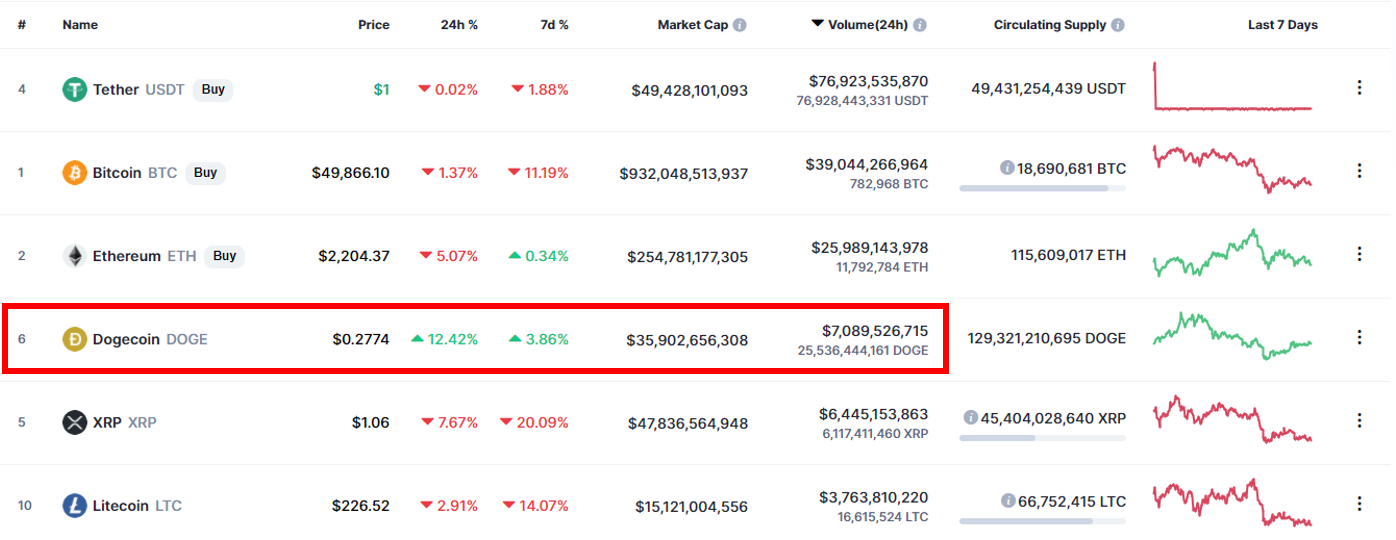 根據 CoinMarketCap 數據,至截稿前狗狗幣仍以 70.9 億美元,位居交易量第四大幣種;同期間比特幣交易量約 390.4 億美元。