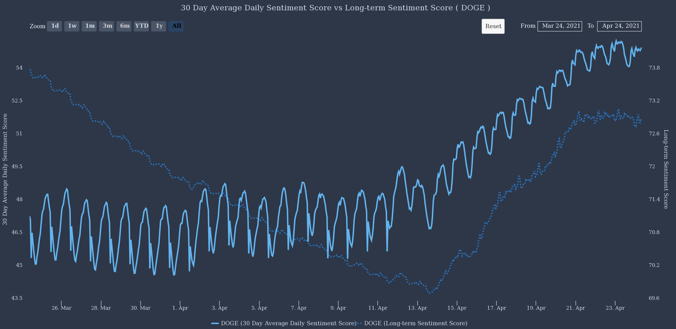 -狗狗幣 30 日內平均每日情緒分數|來源:CoinTelegraph,The Tie-