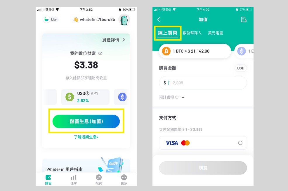 a) 身份認證確認通過後,即可選擇下方「錢包」頁面,然後點擊【儲蓄生息(加值)】- 【線上買幣】
