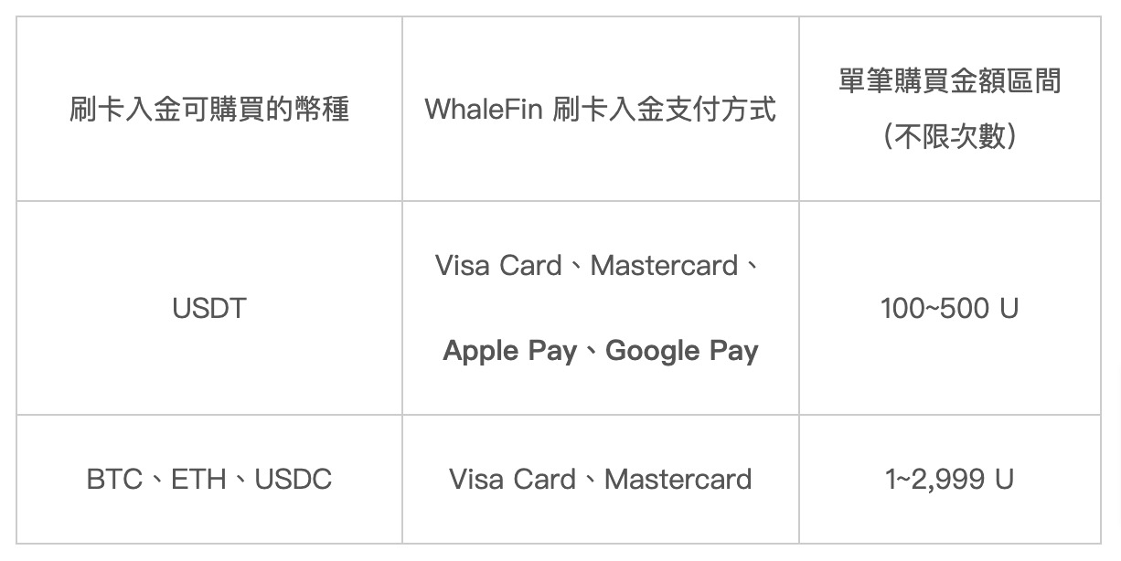 - WhaleFin 刷卡入金目前支援 4 種幣種:BTC、ETH、USDC、USDT。