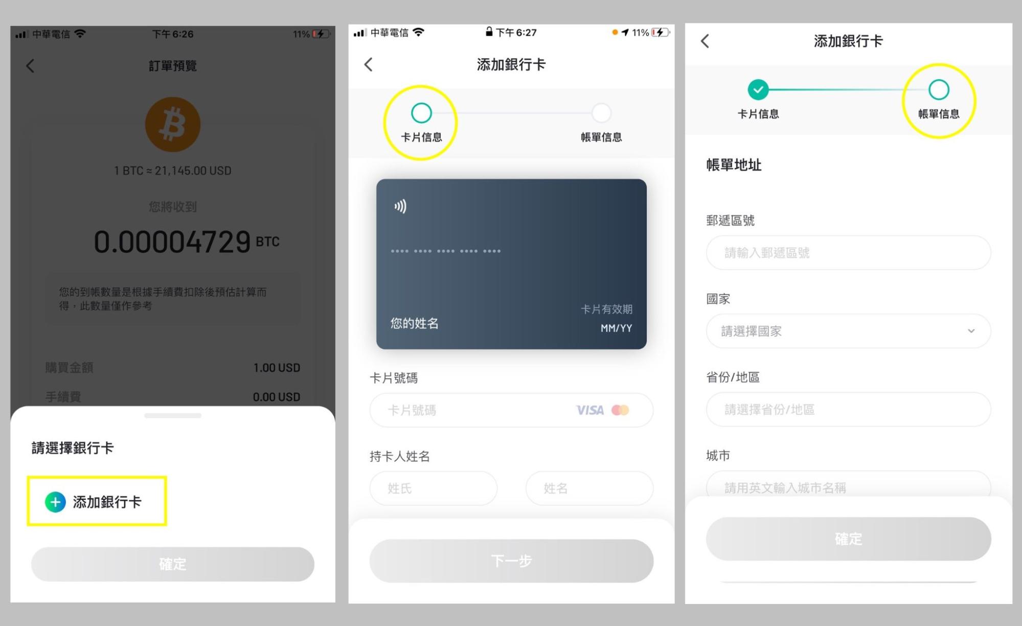 c) 點擊【添加銀行卡】,輸入銀行卡資訊,按【下一步】,按指示填寫帳單資訊(地址須以英文填寫),按【確定】。