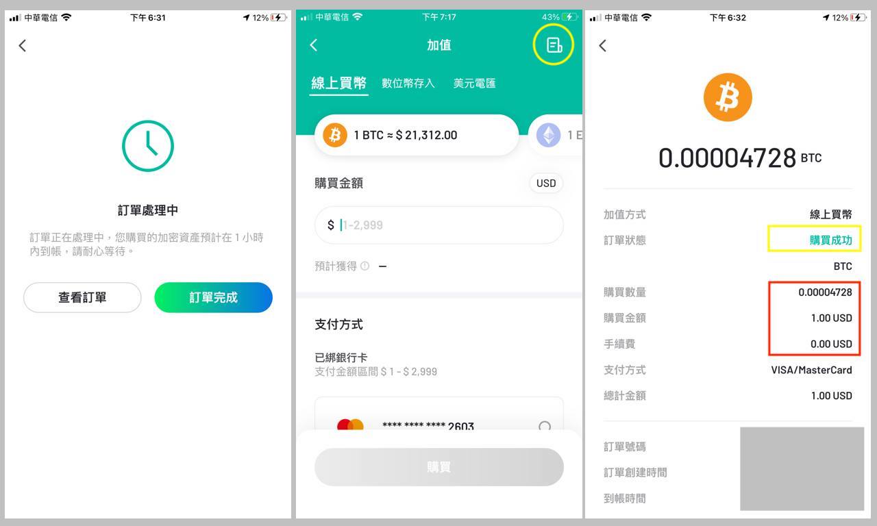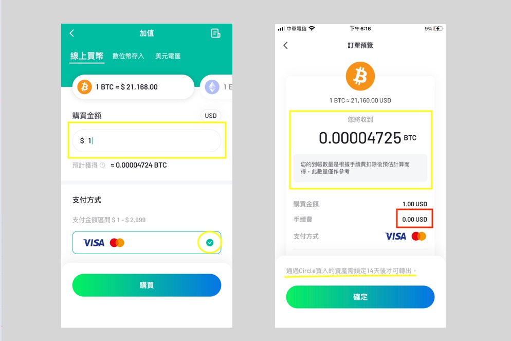 b) 以 BTC 做示範,於「購買金額」欄位填寫購買最低入金門檻: 1 美金,勾選支付方式 VISA / Mastercard,點擊【購買】後會出現訂單預覽( 此 BTC 數量僅作參考,最後到帳數量是根據手續費扣除後預估計算而得)
