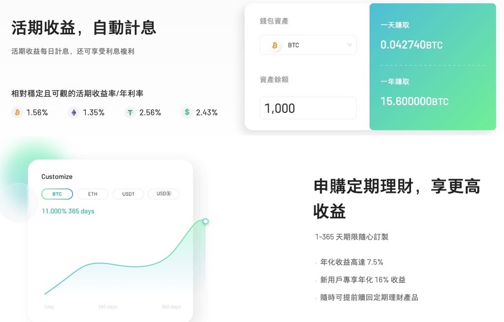 用戶可依需求,申購固定天數的定期理財,比如 30 / 60 / 90 / 180 天等;或者你也可以自行定義期限 ( 1-365 天),系統將自動幫您計算利息。此項產品依幣種不同最高年化收益從 7.5%~15% 不等;新用戶則專享年化 16% 收益。