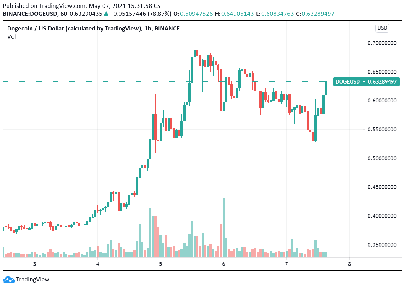 據 Trading View 數據,狗狗幣(DOGE)本月 5 日創下 0.6972 美元歷史高點,隨後向下修正。今天早上跌至 0.5176 美元後反彈,一小時大漲 8.2% 至 0.6 美元以上。在馬斯克推文發出後,漲勢繼續擴大,一度回到 0.6490 美元,四小時內上漲 15%。