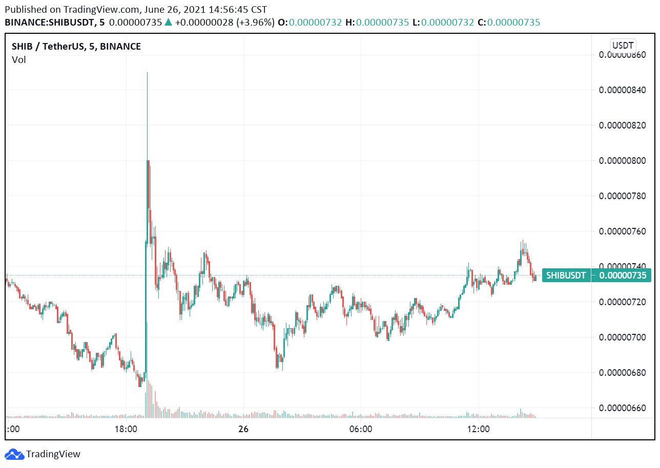 儘管近一個月來「馬投顧」光環已經在比特幣(BTC)市場上煙消雲散,但顯然這次的主角柴犬幣(SHIB)還沒放棄對馬斯克的信仰。該代幣在他的推文發出後,10 分鐘內急漲 25.6%,來到 0.0000085 美元高點。至截稿前 SHIB 報 0.00000735 美元,市值 28.2 億美元。