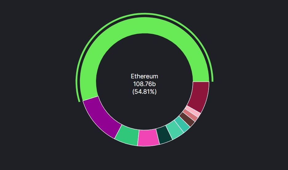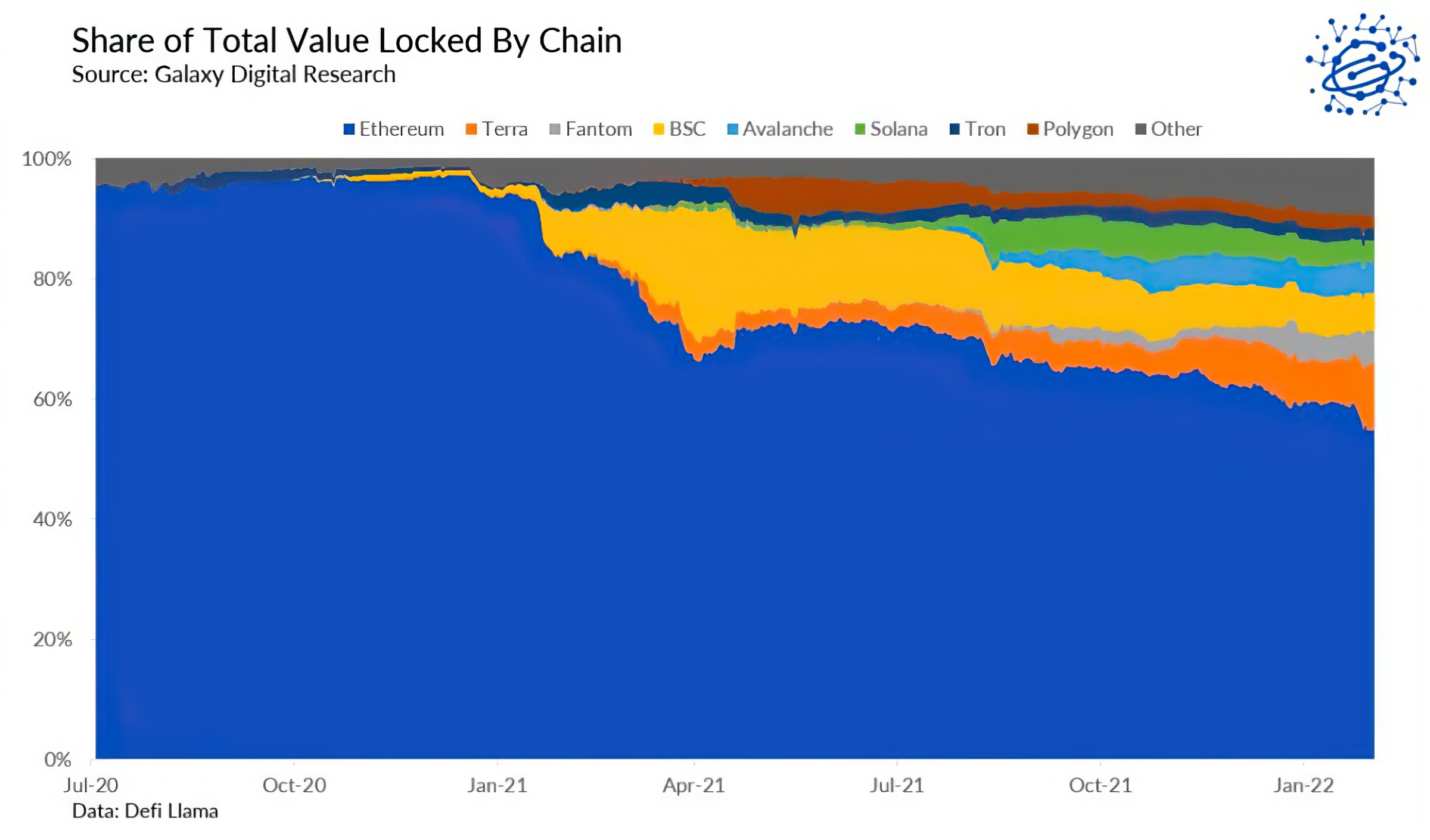 不過值得注意的是,以太坊的主導地位,已經開始被其他區塊鏈削弱。根據 Galaxy Digital Research 公布的最新數據,以太坊在所有區塊鏈總鎖倉價值(TVL)的比重已下降至 55% 以下,創下有史以來的新低。
