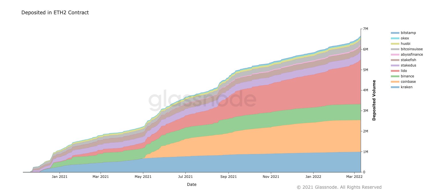 另外,根據 Glassnode 提供的另一項數據,在所有這些質押資金中,至少有 66% 是由交易所和質押服務機構存入,而非個人質押者存入,其中,去中心化質押解決方案 Lido Finance 的質押比重最高,達到 22% ,美國加密貨幣交易所 Coinbase 則以 15% 位居第二。