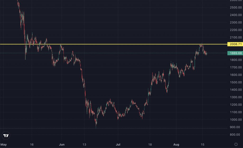 以太坊合併(The Merge)臨近的利好,推動 ETH 價格持續走強,上週末挑戰六月份前高(1,972 美元)衝破 2 千大關來到 2,030 美元價位後遭遇阻力,暫時在 1,900 美元附近震盪,現報 1,889 美元,近 24 小時下跌 0.72%。