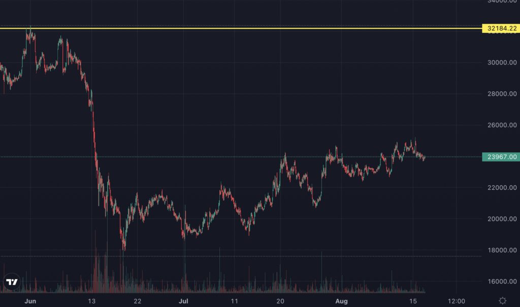 比特幣方面相較以太坊就相較弱勢,距離六月份高點的 3.2 萬美元還有一段不小的距離。近一週則大約在 2.4~2.5 萬美元之間來回震盪、且交易量呈現逐漸萎縮的狀態。
