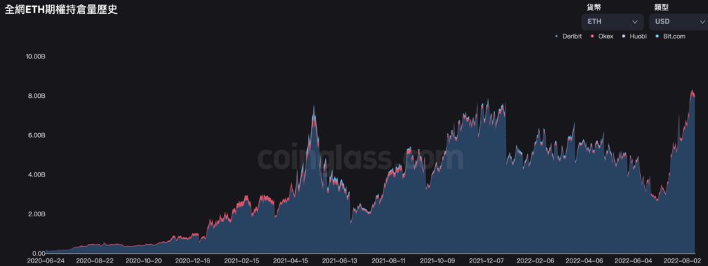 雖然以太坊價格並沒有站穩兩千美元,但近期以太坊選擇權交易的需求激增。據 Coinglass 數據顯示,本週以太坊選擇權持倉量總額一度飆破 83 億美元、創下歷史新高,幾乎是一個月前的三倍,目前稍有回落在 80 億美元附近。